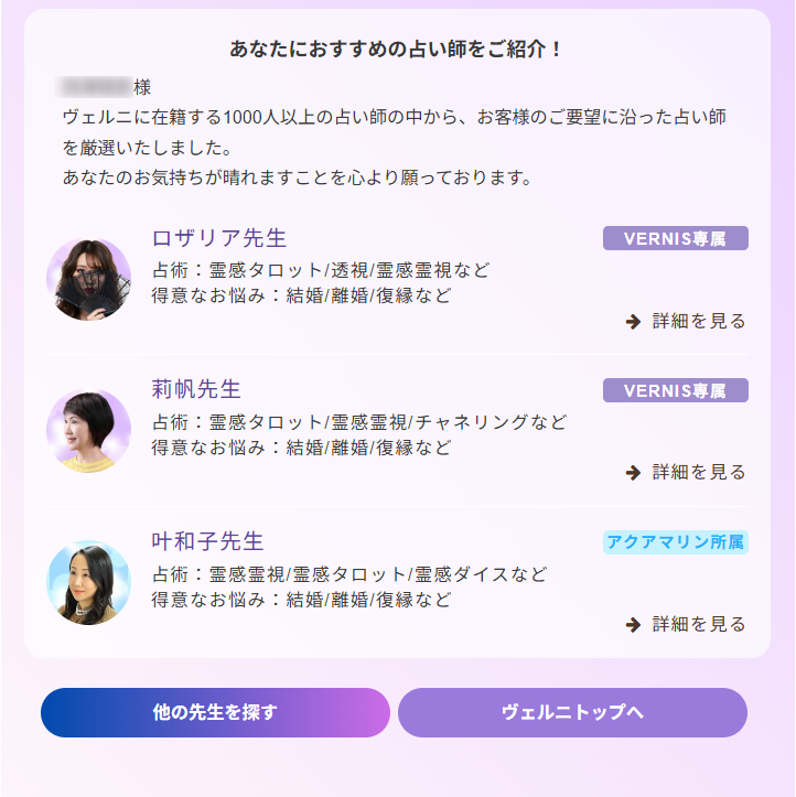 ヴェルニには、たくさんの占い師が在籍しています。メール占いが可能な占い師は限られるのですが、それでも選びきれないほどなので、どの占い師を選べば良いのか迷ってしまいますよね。